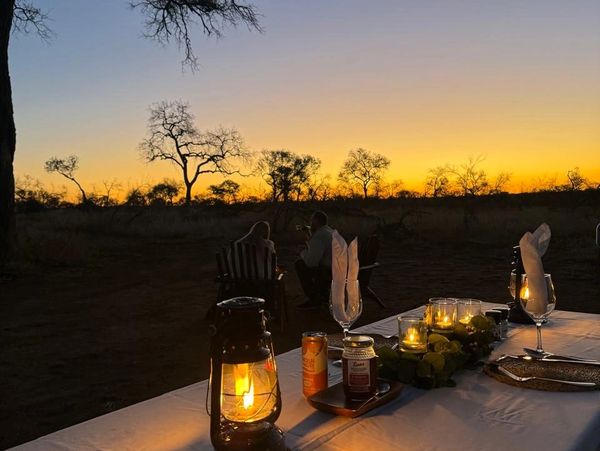 Embark on an unforgettable safari game drive in the Greater Kruger! We invite you to hop aboard our comfortable game vehicle, specially designed for optimal wildlife viewing. With our experienced and knowledgeable guides at the helm, we'll traverse the vast landscape in search of the majestic animals that call this untamed sanctuary home. Feel the thrill of anticipation while we navigate through rugged terrain, following the track and sign left behind by Africa's iconic wildlife. From the small things such as colorful birds to the bigger, more thrilling, like roaring lions and giant elephants, every moment promises to be a treasure trove of discovery. After about two and a half hours of our safari drive, we will stop at our beautiful bush dinner site, where our chef will be awaiting our arrival. The fire will be warm and crackling and you can enjoy a drink while the plates your first course. This is a three course dining experience, where you will be served a starter, main and a dessert. While you enjoy your meal, hear the sounds of the African bush that surrounds you.